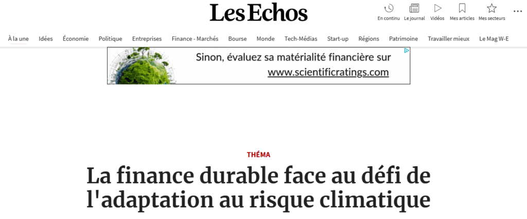 SCR CEO Rémy Estran-Fraioli contributed insights to a Les Echos article titled “Sustainable finance faces the challenge of adaptation to climate risks”, addressing the systemic risks faced by the private sector in France.