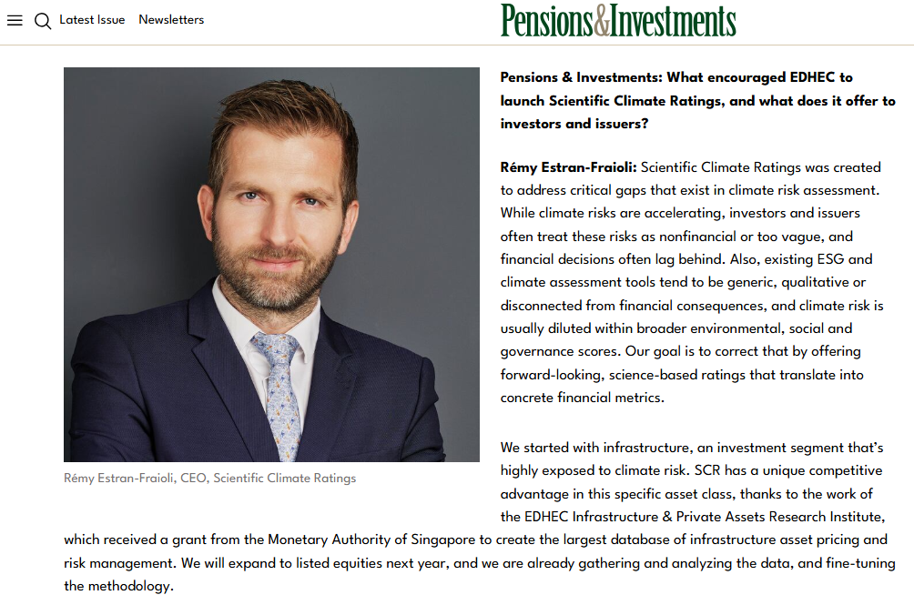 In an interview published by Pensions & Investments (P&I), Rémy Estran-Fraioli, Chief Executive Officer of Scientific Climate Ratings (an EDHEC venture), outlined how his agency is redefining climate risk assessment for institutional investors.