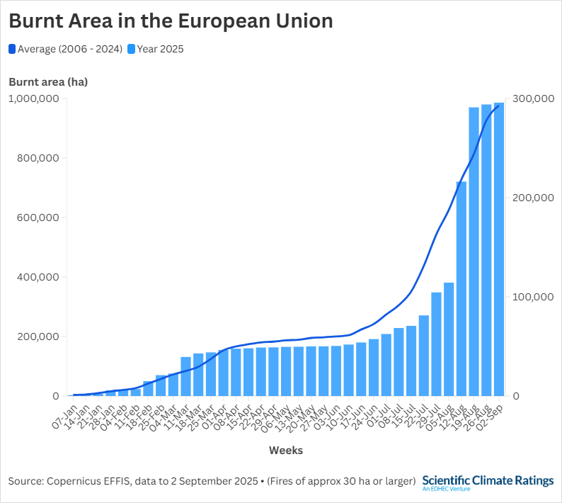 As of September 2, over 986,000 hectares have burned across more than 1,923 fires, up from 227,627 hectares recorded in the same period last year, according to Copernicus European Forest Fire Information System (EFFIS).