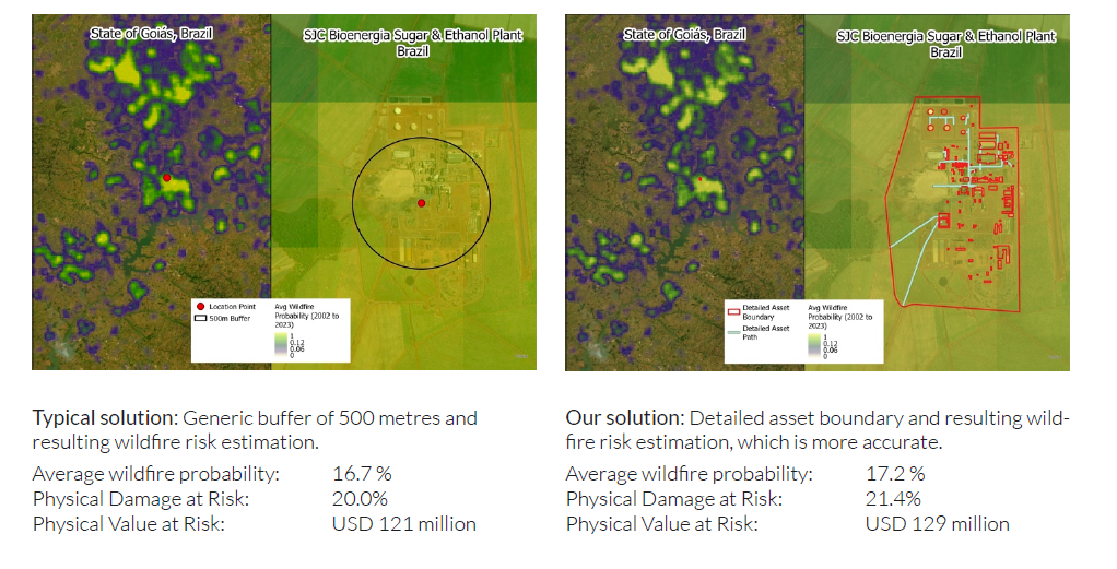 We can illustrate this approach in the example of the SJC Bioenergia Sugar & Ethanol plant in Brazil (shown in the figure below). The generic radius approach (on the left) produces an underestimation of wildfire value-at-risk by at least USD 8 million compared to the damage estimations of our detailed asset boundary approach.