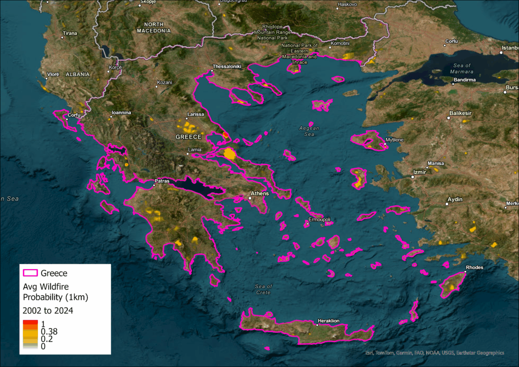 Map showing average wildfire probability (1 km) between 2002 and 2024 in Greece, EDHEC Climate Institute