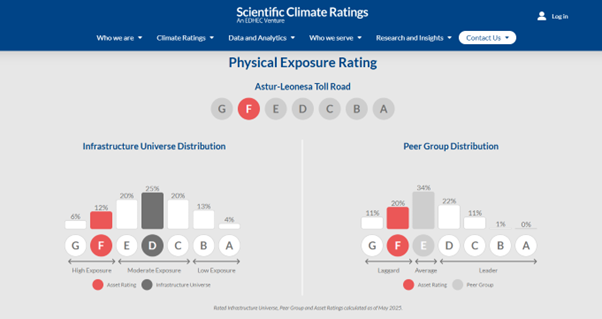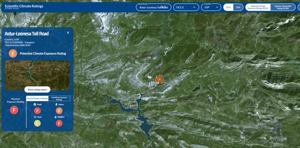 Our Potential Climate Exposure Ratings (PCER) leverages this approach to compute an exposure rating from A (lowest risk) to G (highest risk) for each asset. The example of the Astur-Leonesa Toll Road (AP-66), a critical motorway in Spain between Asturias and the Castilian Meseta, demonstrates its real-world application. Spain is one of the most impacted countries by climate change in southeastern Europe. The Physical Exposure Rating of this transport is rated F, indicating higher wildfire risks.